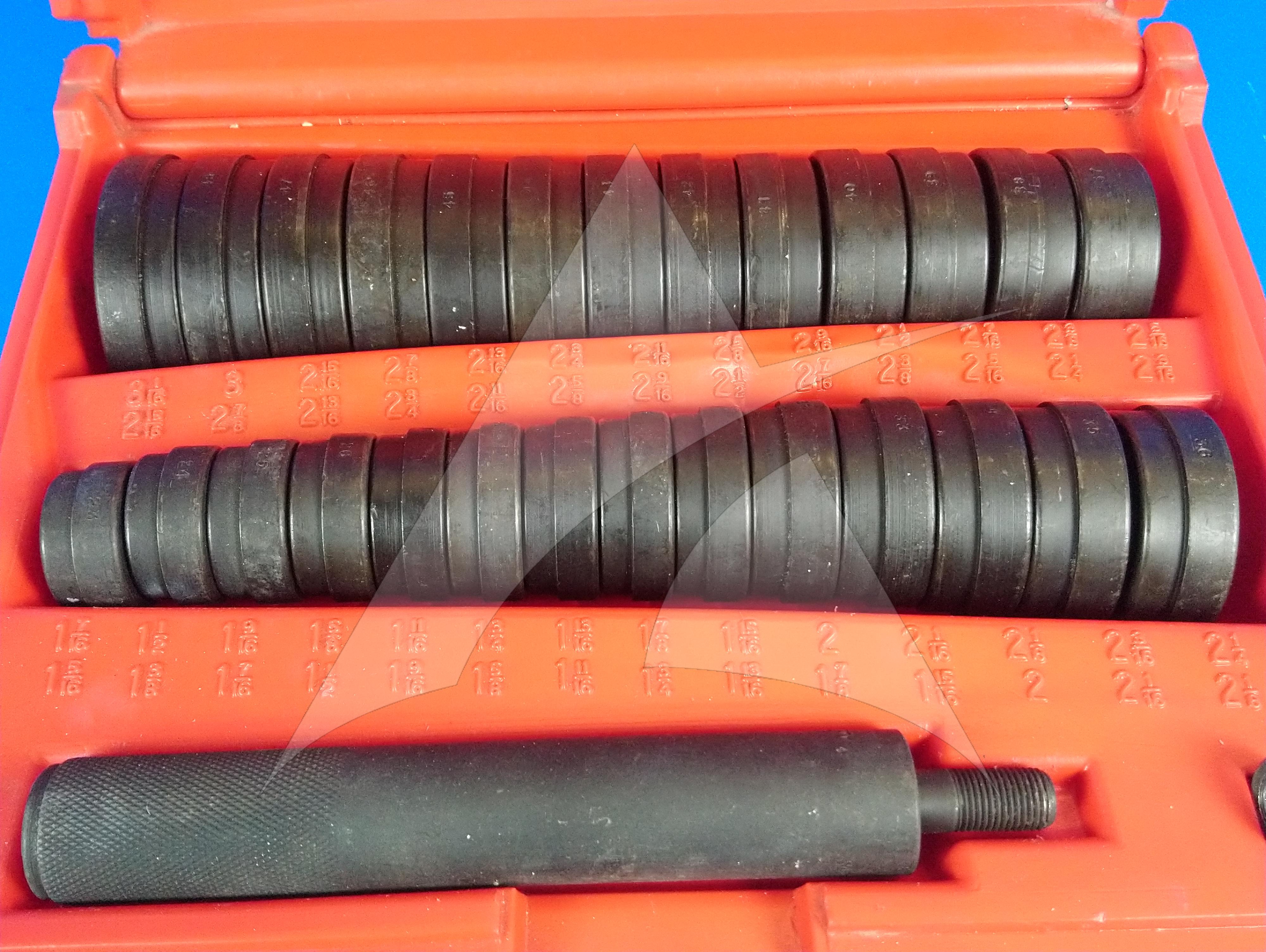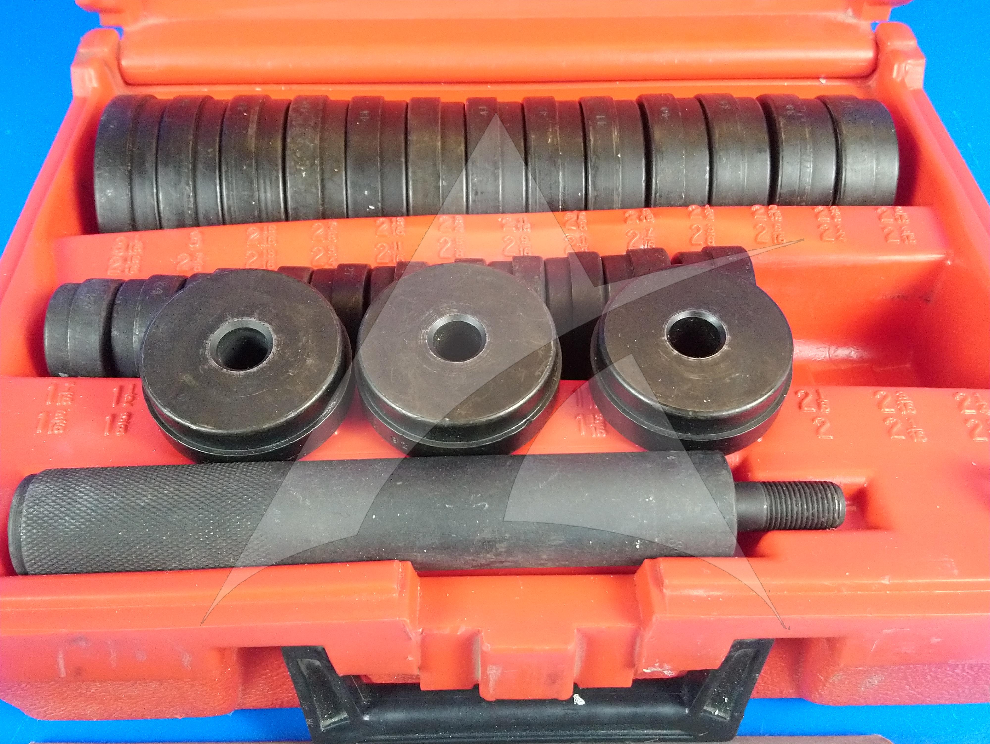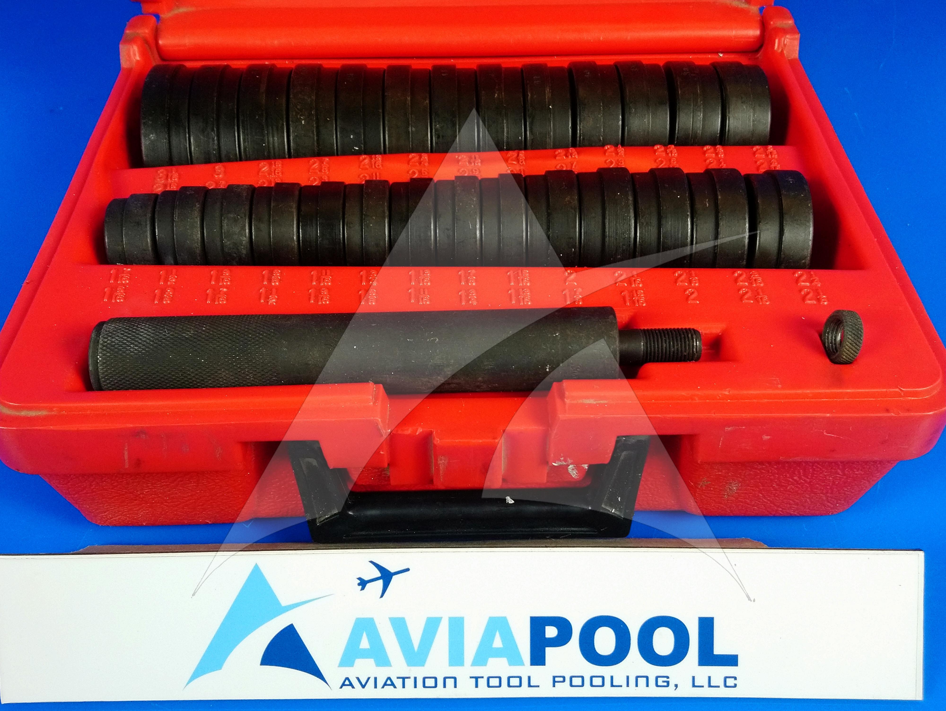 Tech Appraisal: HEAVY-DUTY BUSHING DRIVER SET. KIT IN VERY GOOD CONDITION. NO EVIDENCE OF DAMAGE OR DEFORMATION. LARGE DRIVE HANDLE WITH KNURING SURFACE FINISH IN VERY GOOD CONDITION. HANDLE HAS THREAD FOR DRIVE NUT.