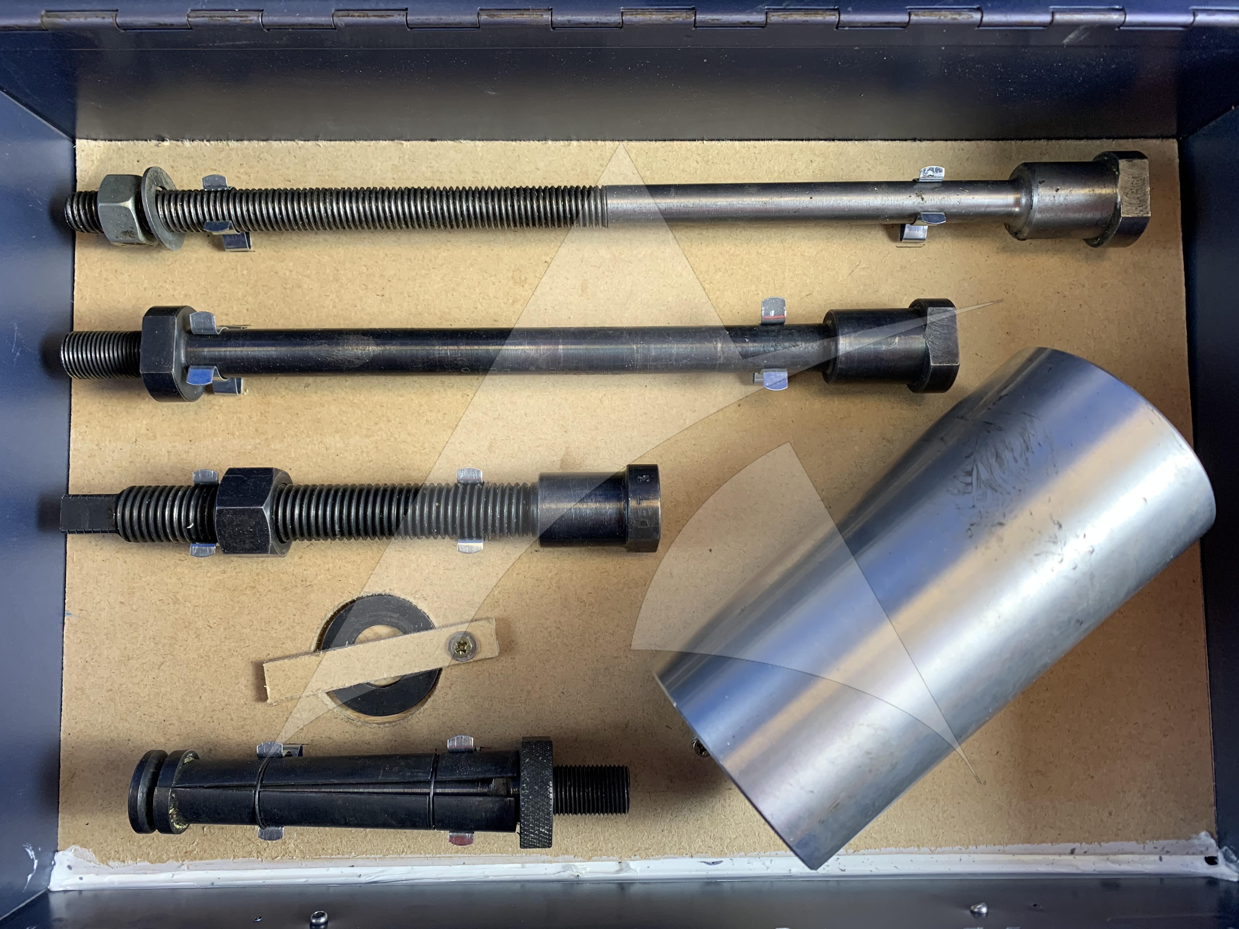 Tech Appraisal: UNIT IN GOOD CONDITION. FULL COMPLIMENT OF PULLER KIT, INCLUDING; X3 THREADED BAR OF VARYING LENGTHS, X1 SPLIT PULLER AND X1 CYLINDER. ALL THREADS ASSESSED AS SATIS, WITH NO EVIDENCE OF DEFORMATION OF DEFECT TO ANY OF THE KITS COMPONENTS. EVIDENCE OF PREVIOUS USE, BUT NOTHING NOTED THAT WILL EFFECT FIT/FORM/FUNCTION OF THE TOOL. KIT OFFERED IN STORAGE/TRANSPORTATION BOX IN SERVICEABLE CONDITION.
